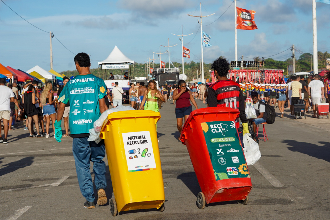 Ação de compromisso com o meio ambiente, o Recicla MA formou frente com os catadores mais uma vez para movimentar a cadeia produtiva de reciclagem no Carnaval do Maranhão. Durante o período foram coletadas mais de 16 toneladas de resíduos no Circuito Vem pro Mar (Avenida Litorânea), em São Luís, e nas festas de Lava-Pratos em Imperatriz e São José de Ribamar.